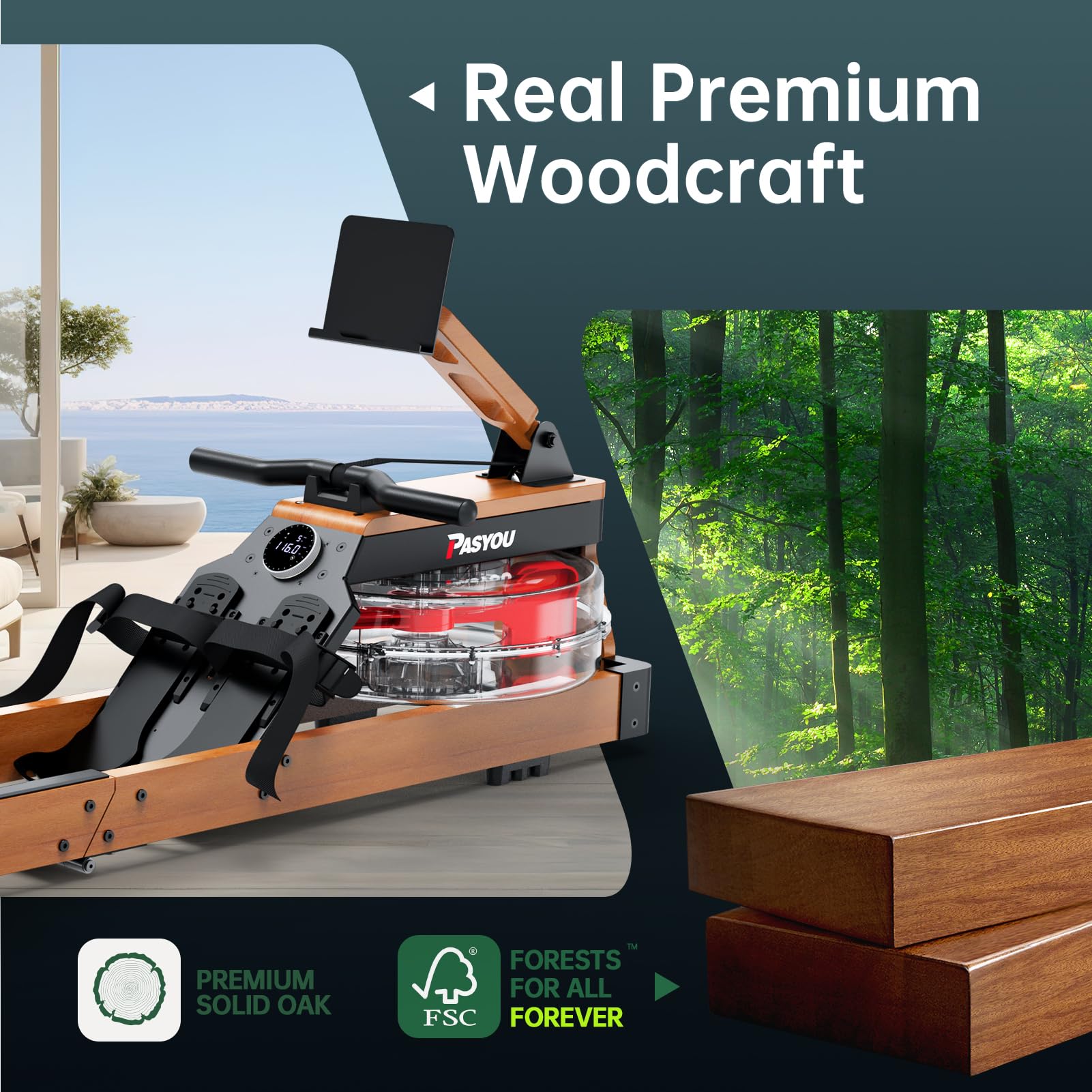 PASYOU Máquinas de remo de agua para el hogar, máquina de remo plegable de madera de roble, capacidad de peso de 350 libras, máquinas de remo ajustables de 6 niveles con monitor y soporte de