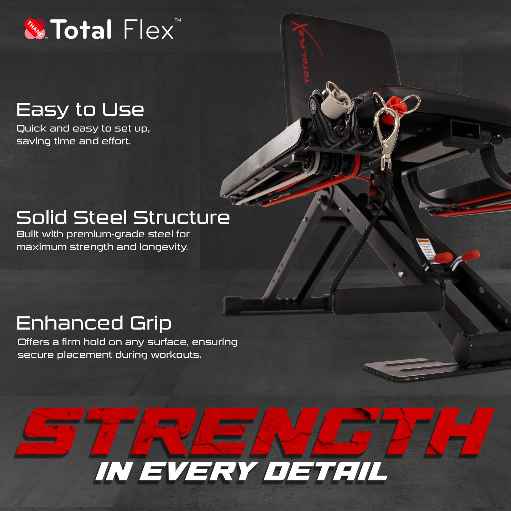 - Incluye: 1 x Banco de press plegable TOTAL FLEX L, 1 x Placa para los pies, 2 x Correas para los tobillos, 2 x Empuñaduras con clips para permitir sets de pesas de resistencia intercambiables, 1 x Manual de instrucciones