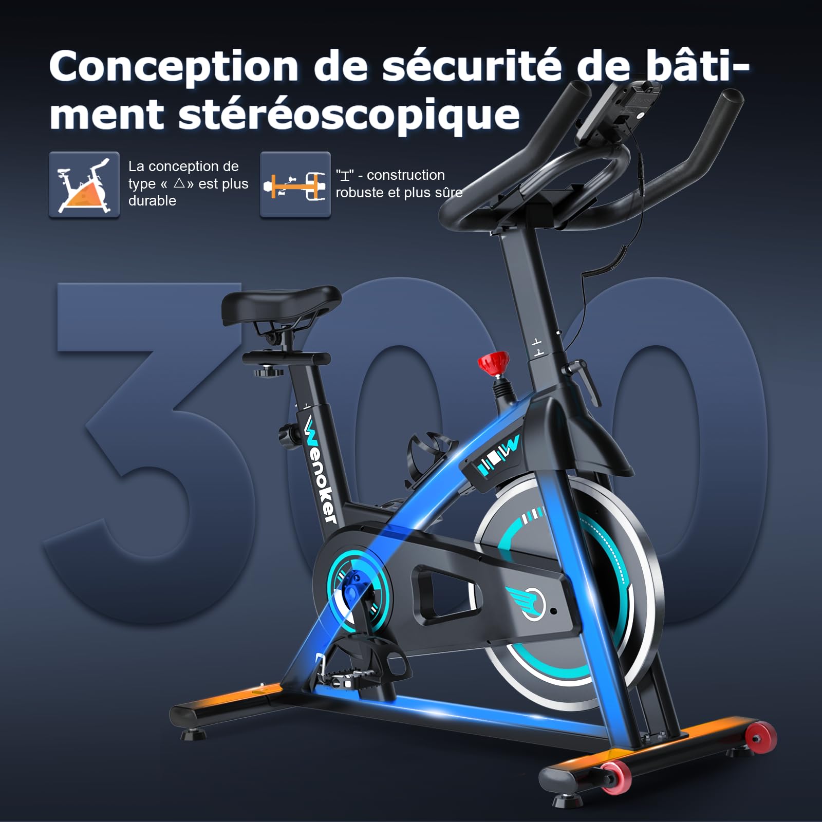 - [Après des années de recherche, Wenoker a mis au point ce vélo d'appartement amélioré. Il est doté d'une construction en acier aluminium plus épaisse et durable et d'une nouvelle poignée en forma de 7 sur le guidon avant qui garantit que le vélo d'exercice repose fermement sur le sol et qu'il ne vacille pas pendant l'utilization. L'élégant design noir et bleu est du plus bel effet à la maison ou dans votre salle de sport.