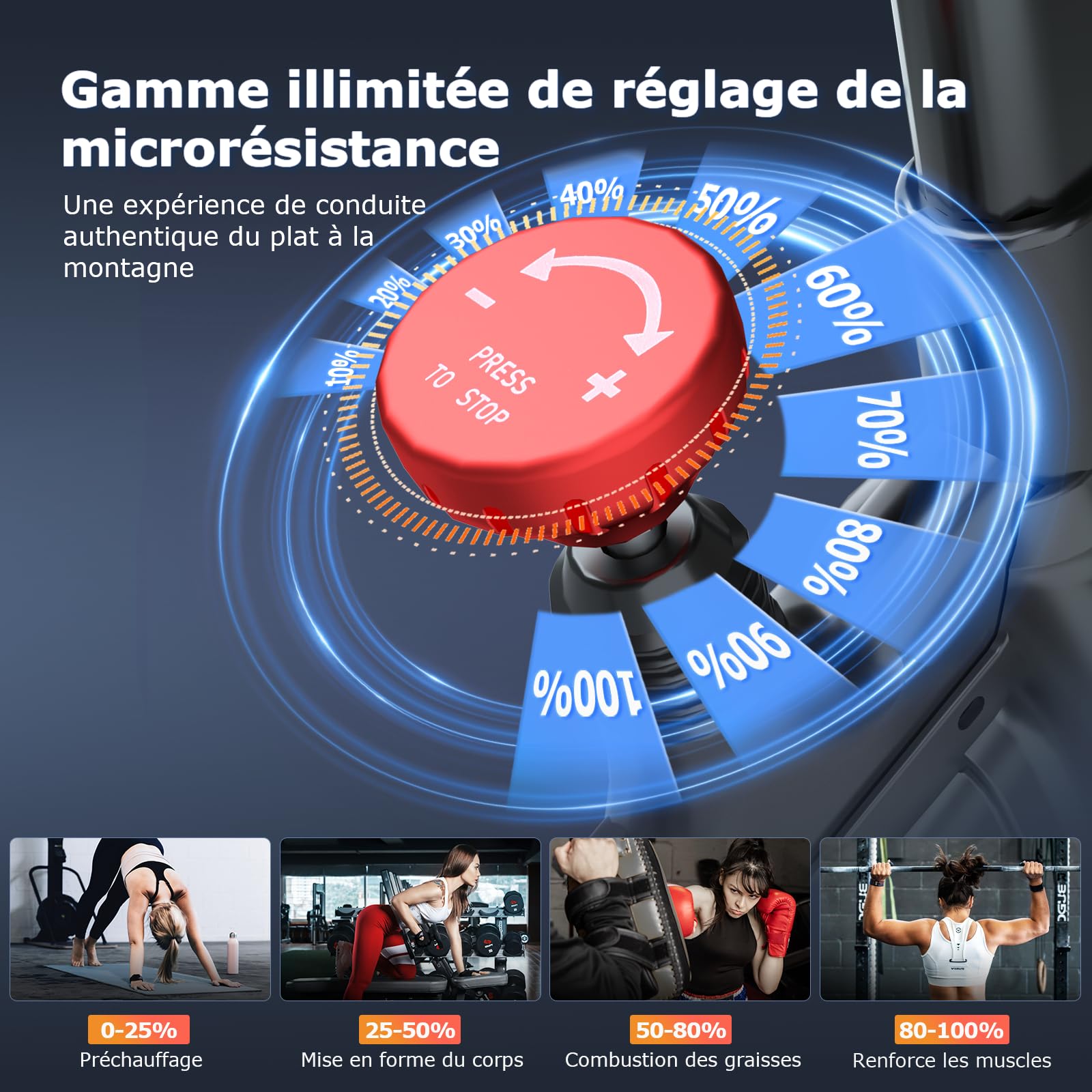 - [FREIN & RESISTENCIA] : Il suffit de tourner le bouton pour augmenter ou diminuer le réglage selon les différents niveaux qui vous conviennent le mieux. Appuyez sur le même bouton pour vous arrêter rapidement et en toute sécurité. Le fonctionnement pratique rend les mouvements plus faciles et plus efficaces.