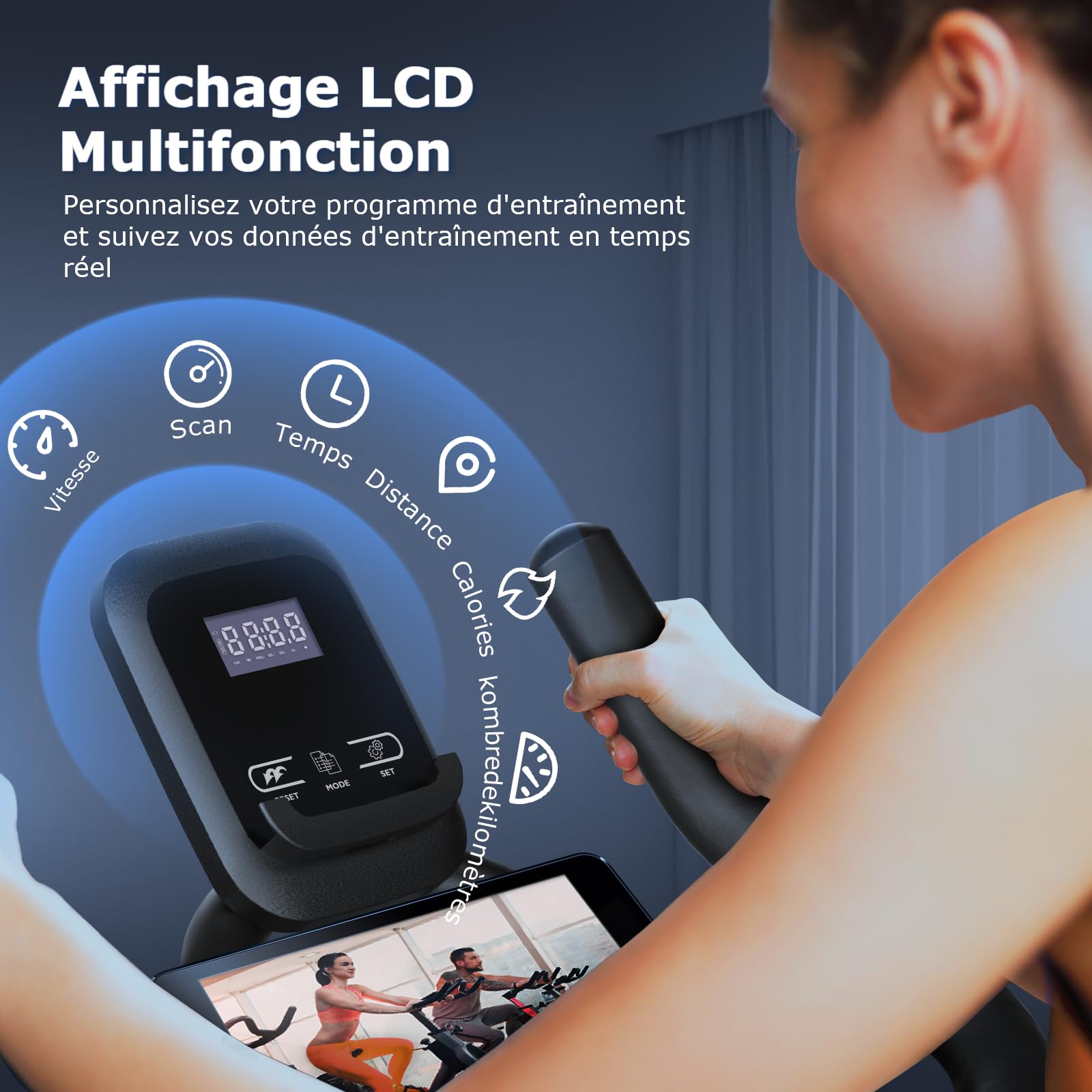 - [Moniteur LCD et support for tablette]: L'écran numérique multifonctionnel peut suivre votre temps d'entraînement, votre vitesse, les calories brûlées, la distancia, etc. Il vous aide à comprendre les progrès de votre entraînement et à ajuster votre plan D'entraînement. Le support pour tablette permet d'accueillir facilement les appareils mobiles, ce qui vous permet de faire du sport et de vous divertir en même temps.