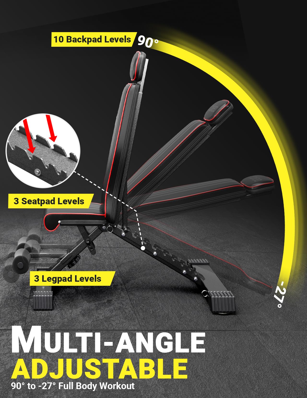 - 【16 opciones ajustables y 90 grados vertical】Nuestro banco de pesas ajustable tiene 10 ajustes de espalda, 3 ajustes de asiento y 3 ajustes de piernas más que otros bancos de pesas para su entrenamiento de cuerpo entero. Con un respaldo vertical de 90 grados, este banco de pesas plegable ofrece una gran experiencia para su prensa de hombro con mancuernas.